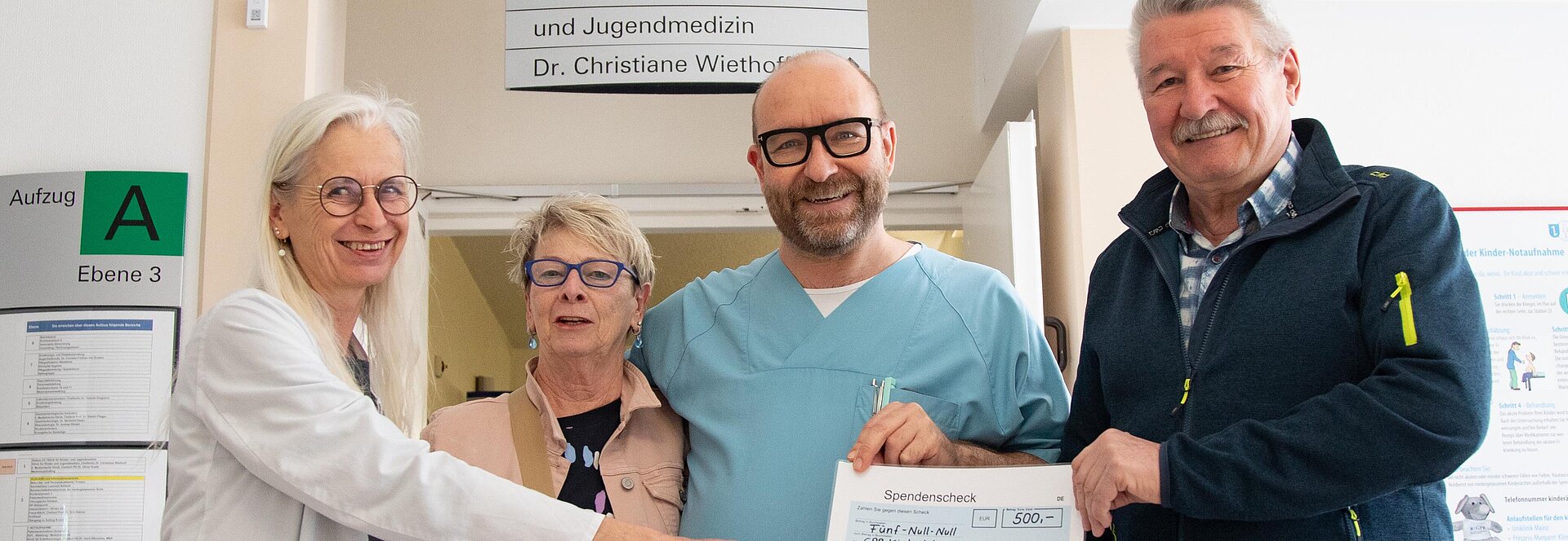 Eine großzügige Spende von 500 Euro erhielten Dr. Christiane Wiethoff, Chefärztin der Klinik für Kinder- und Jugendmedizin und Oberarzt Mario Berwald Oberarzt, Vorsitzender des Fördervereins „fiPs“, von Herrn Michael Schilling, der die Spende persönlich in Begleitung seiner Frau Ute im GPR Klinikum überbrachte.