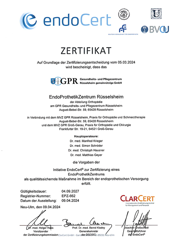 Das GPR Gesundheits- und Pflegezentrum in Rüsselsheim am Main setzt weiterhin auf höchste Standards in der Patientenversorgung. In der Orthopädischen Klinik des GPR Klinikums unter der Leitung des Chefarztes Dr. Manfred Krieger wurde das Endoprothetikzentrum durch das unabhängige Zertifizierungsinstitut EndoCert nach den Richtlinien der Deutschen Gesellschaft für Endoprothetik (AE) erfolgreich zertifiziert.