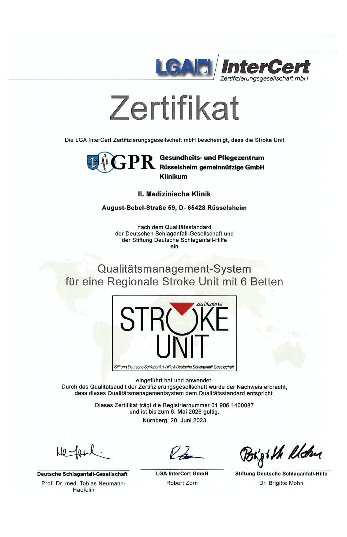 Die seit Herbst 2014 durch die deutsche Schlaganfallgesellschaft zertifizierte Stroke Unit am GPR Klinikum Rüsselsheim ist eine Spezialeinrichtung für Schlaganfallpatienten. Sie wurde im Jahr 2007 etabliert und steht unter der Leitung von drei neurologischen Fachärzten – Dr. Johannes Richter, Dr. Marcel Féchir und Dr. Paul Samp – die neben der Betreuung der Schlaganfallpatienten auch die Versorgung von Patienten mit anderen neurologischen Krankheitsbildern sicherstellen. Es besteht eine langjährige enge Kooperation mit dem auf dem Klinikgelände angesiedelten MVZ Standort Neurologie und Psychiatrie und den dort tätigen Ärzten. Darüber hinaus besteht eine enge Kooperation mit der Universitätsklinik Mainz.
