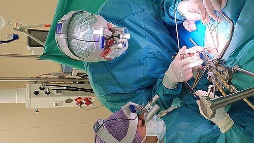 Die Verwendung einer speziellen Lupenbrillemit LED-Licht ermöglicht dem Operateur eine optimale Einsicht in das Operationsfeld, damit die empfindlichen Strukturen wie Nebenschilddrüsen und Stimmbandnerven sorgfältig dargestellt und geschont werden können.