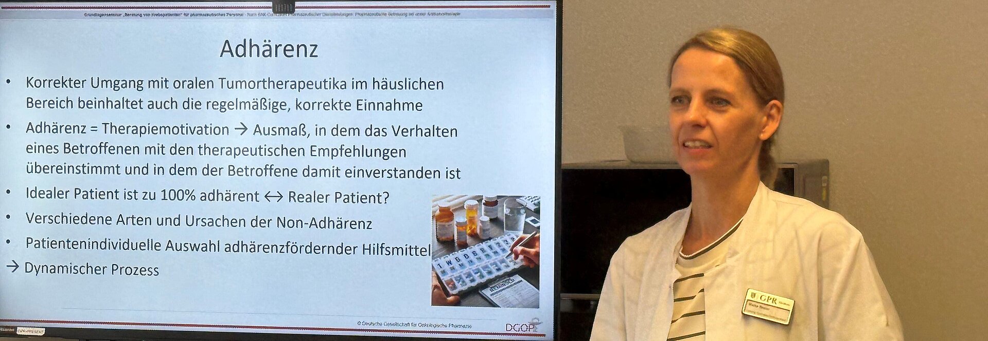 Als Referentinnen der DGOP führten Christine Siebenbürger und Maika Bester, die Leiterin der Klinikapotheke im GPR Klinikum, die Teilnehmenden durch die Fortbildung. Dabei wurde besondere Fachkompetenz im Bereich der oralen Krebsmedikamente vermittelt. Zudem stand die Nutzung der Oralia-Datenbank der DGOP im Mittelpunkt, mit der unter anderem patientenindividuelle Einnahmepläne erstellt werden können. Diese Weiterbildung vermittelt das notwendige Spezialwissen für die Beratung von Patientinnen und Patienten mit oraler Tumortherapie.