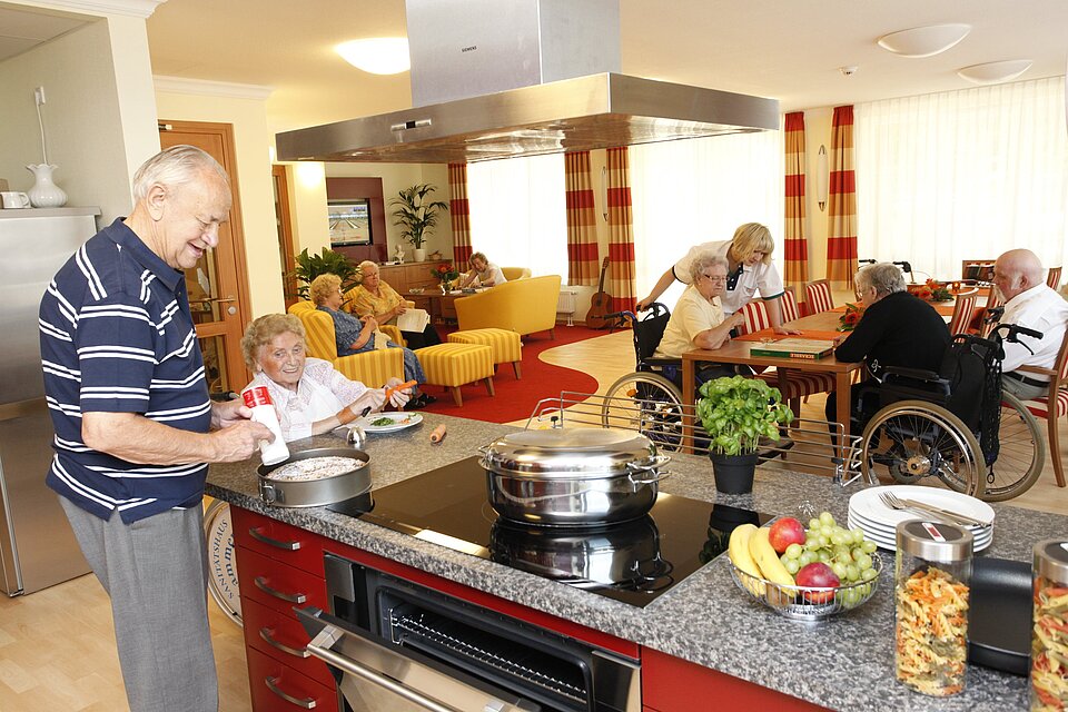Die Mahlzeiten werden z. B. in den Hausgemeinschaften weitgehend durch die Präsenzkräfte zubereitet. Nach eigenem Ermessen können sich die Bewohnerinnen und Bewohner dabei unterstützend einbringen. Der abwechslungsreiche Speiseplan wird in den Hausgemeinschaften gemeinsam mit den Bewohnerinnen und Bewohnern erarbeitet. Hierbei werden individuelle Wünsche der Bewohnerinnen und Bewohner berücksichtigt. Im Bistro unseres Hauses bieten wir Ihnen während der Woche täglich eine Auswahl zwischen zwei Mittagsmenüs an.